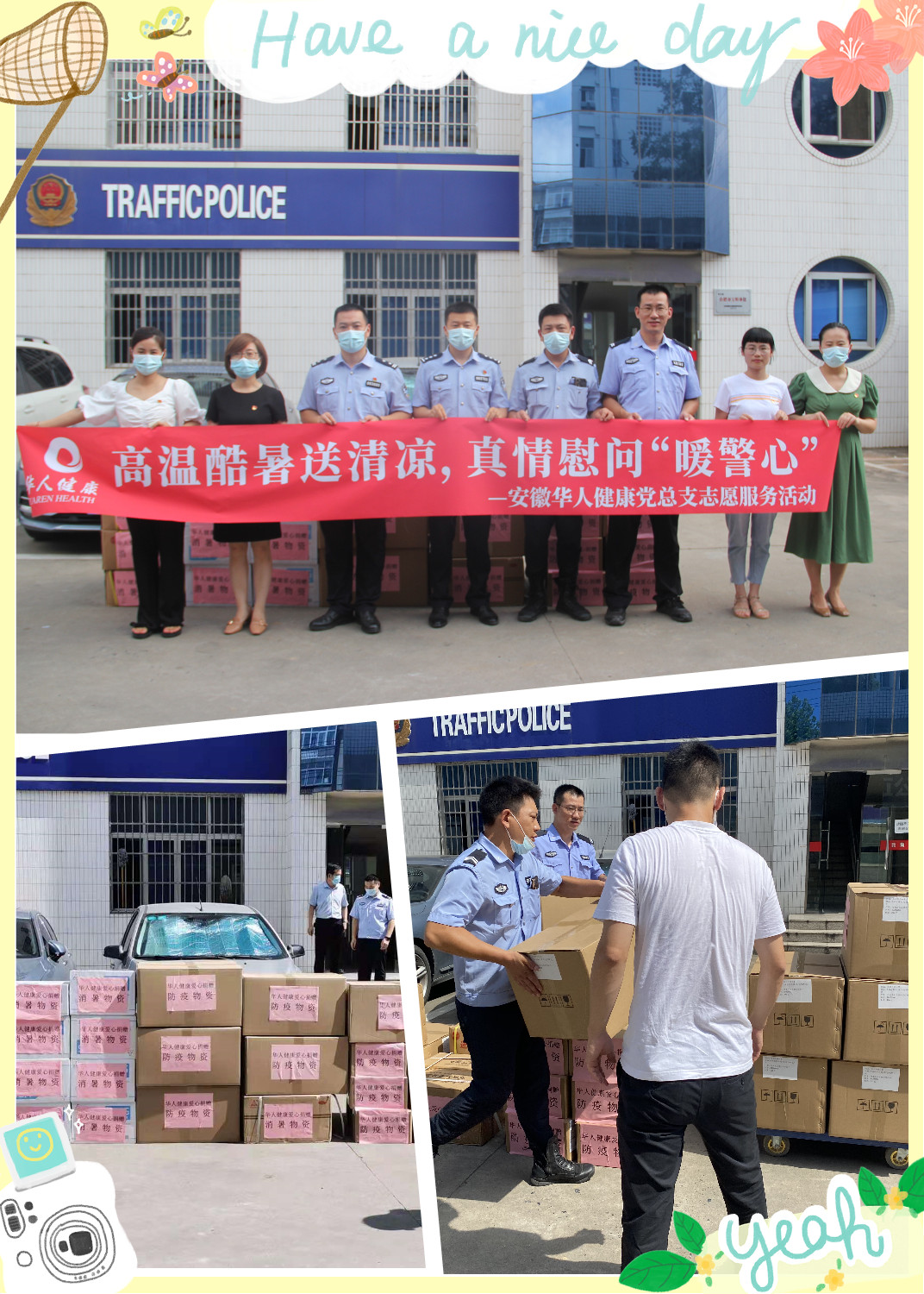 8月6日上午,ng体育党总支携手国胜大药房、汇达药业、天士力、广药潘高寿前往合肥市交警支队包河大队开展以“高温酷暑送清凉,真情慰问暖警心”为主题的慰问活动,为奋战在抗疫一线的执勤干警送去清凉和关怀。